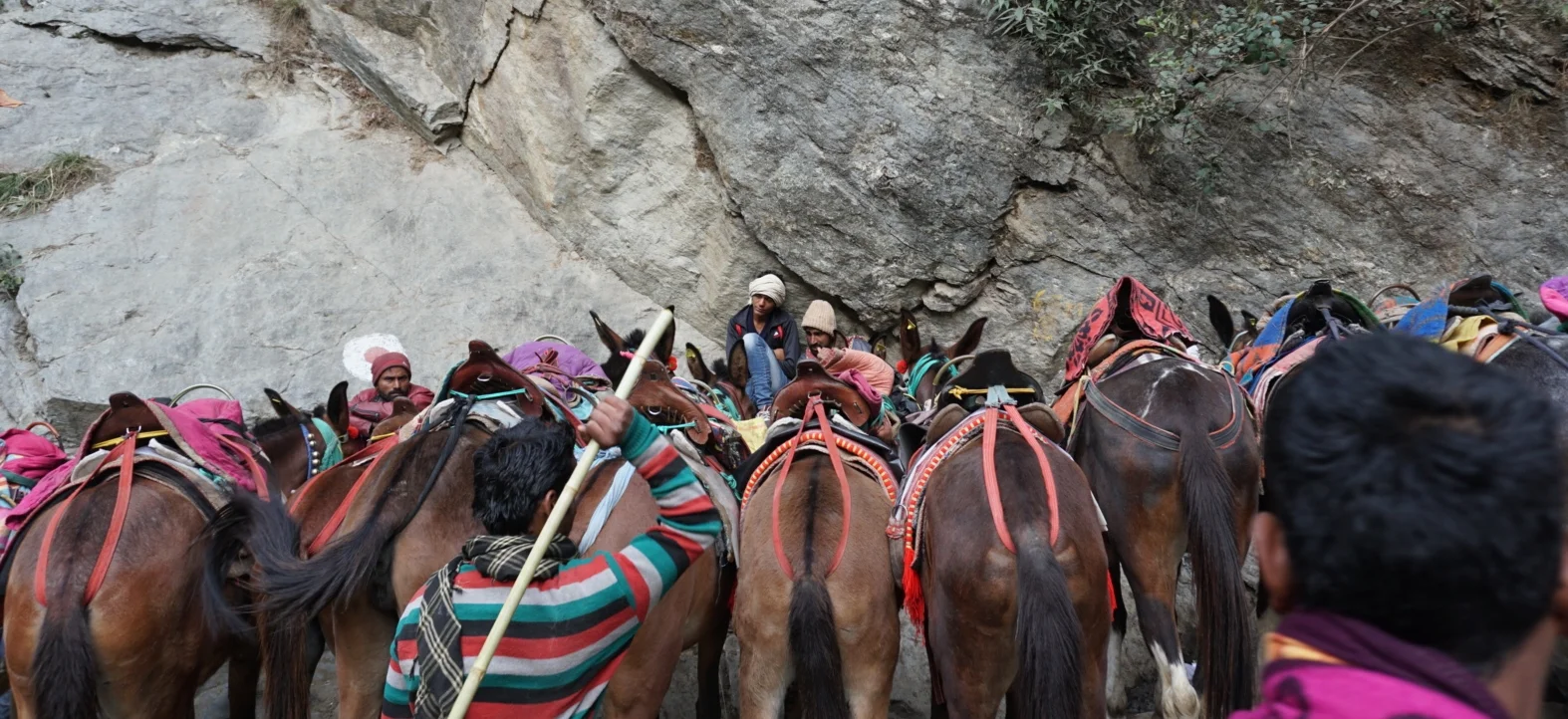 After absorbing this harshness, another hit my eyes — and nostrils. Hundreds of mules and their droppings greeted us outside the hectic bottleneck of Gaurikund village to join us on the journey up. The beasts of burden were a second option for the unwilling or unable to reach the top; hiring four men shouldering an open sedan chair gave a third alternative.